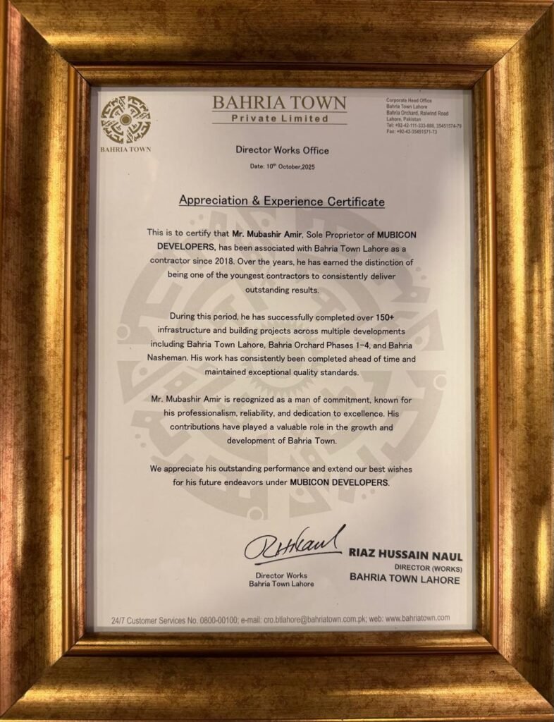 Appreciation & Experience Certificate from Bahria Town Lahore
